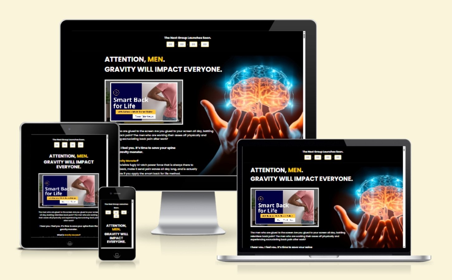 - Brain-Centric UI/UX: A custom-designed interface that uses high-impact visuals to explain the “gravity monster” concept and the neurological approach to back health.
